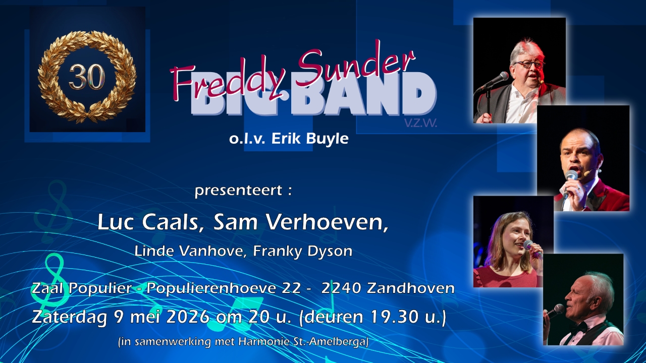 Ter gelegenheid van hun 30-jarig bestaan presenteert de Freddy Sunder Bigband een concert met o.a. Luc Caals, Sam Verhoeven, Linde Vanhove en Franky Dyson in zaal De Populier in hun thuishaven te Zandhoven, dit in samenwerking met de harmonie St.-Amelbergha.